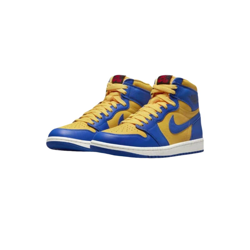 穿着 Varsity Maize、Game Royal、 Sail、 Black 和 Fire Red配色方案。这次推出的Air Jordan 1基本上是2013年"Laney”版本的“反向“版本。它采用Varsity Maize皮革底,在白色中底和蓝色橡胶外底上覆盖皇家蓝色。