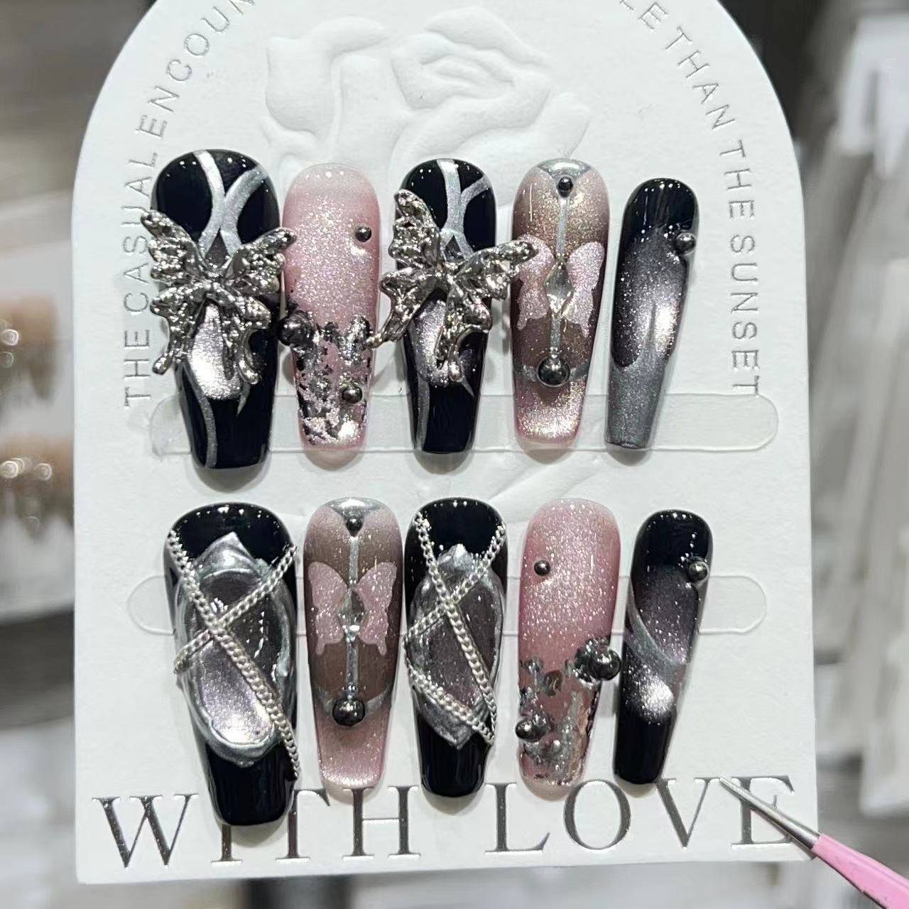 高级重工穿戴甲灯泡猫眼腮红拍拍胶蝴蝶链条可拆卸假指甲贴片
