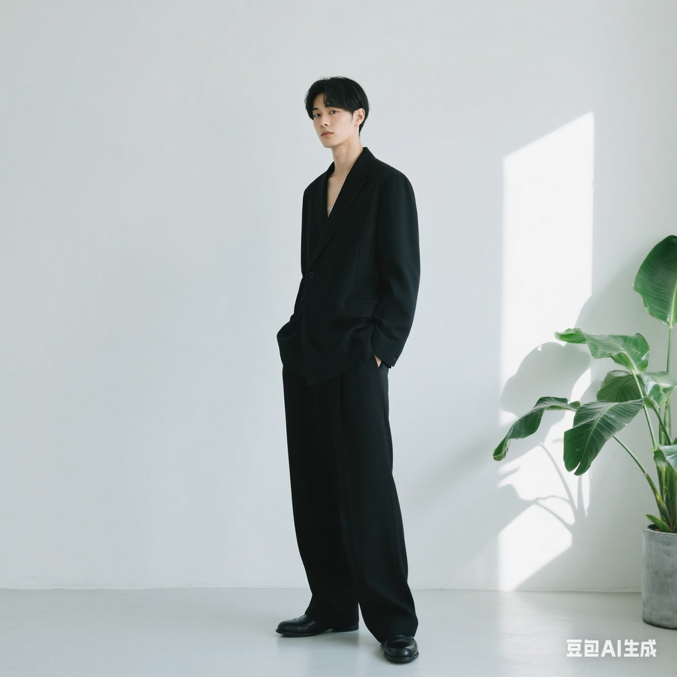 主体是一件黑色简约西装裤,以日系简约风格展现。色彩上以黑色和白色为主,营造简洁纯粹的氛围。