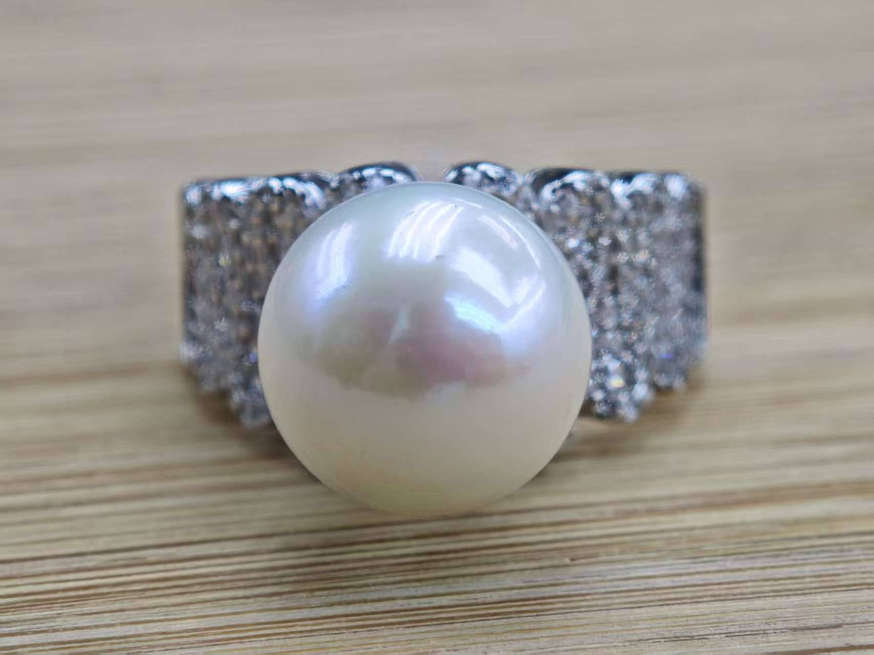 月光灵动6A极光赛澳白珍珠戒指11-12mm爱迪生正圆开口可调节